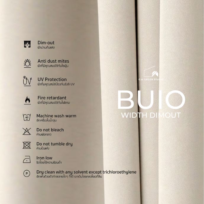 ผ้ากันแสงหน้ากว้าง กันแสงเฉลี่ย 85% ทั้งยังสามารถกันรังสียูวีได้ ด้วยการทอเส้นด้ายสีดำแทรกระหว่างชั้นผ้า