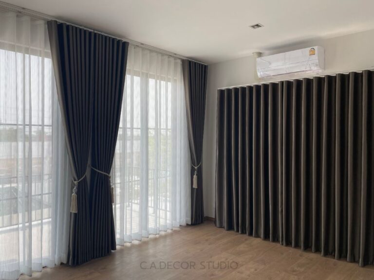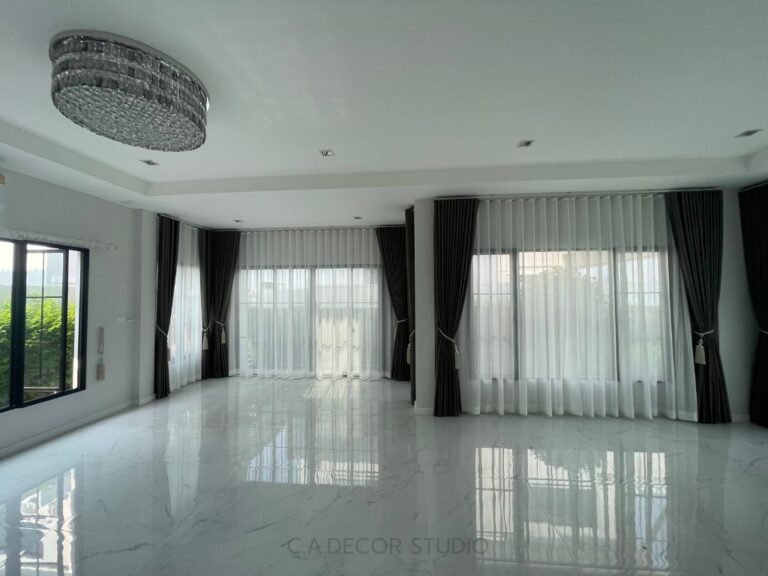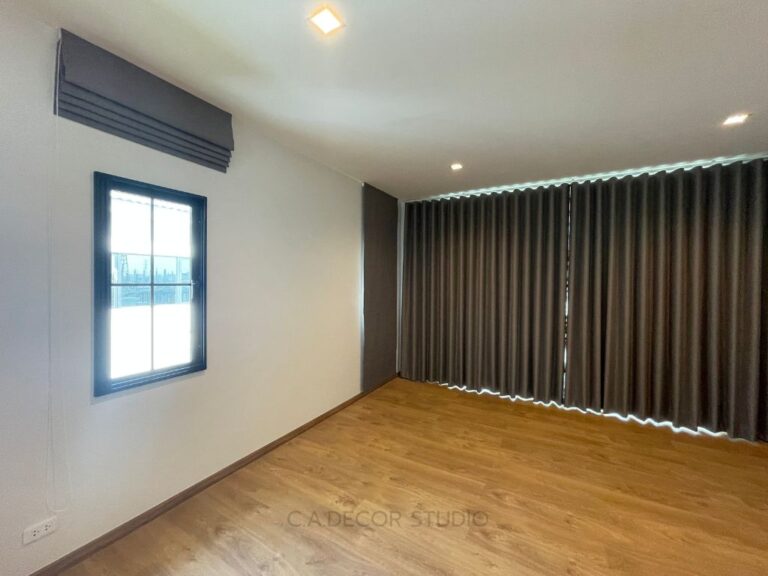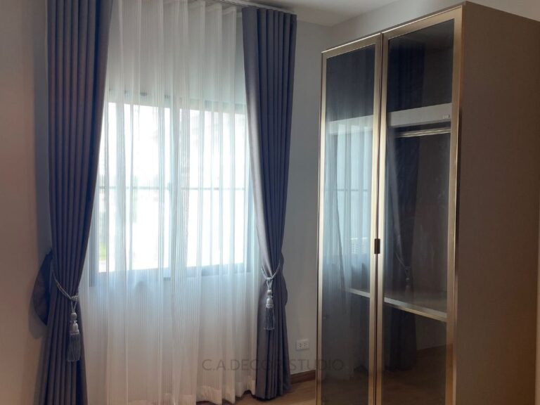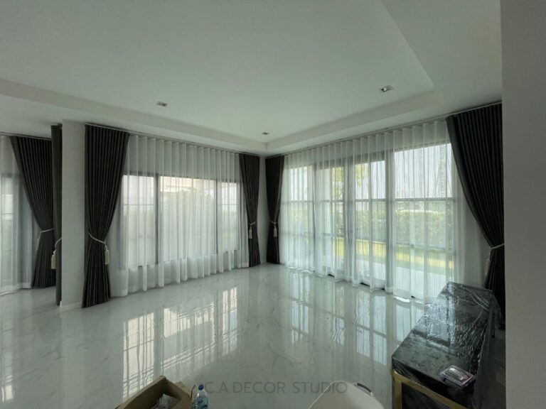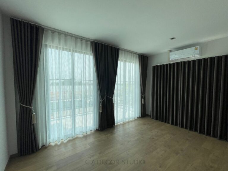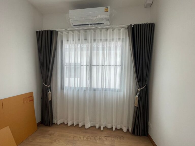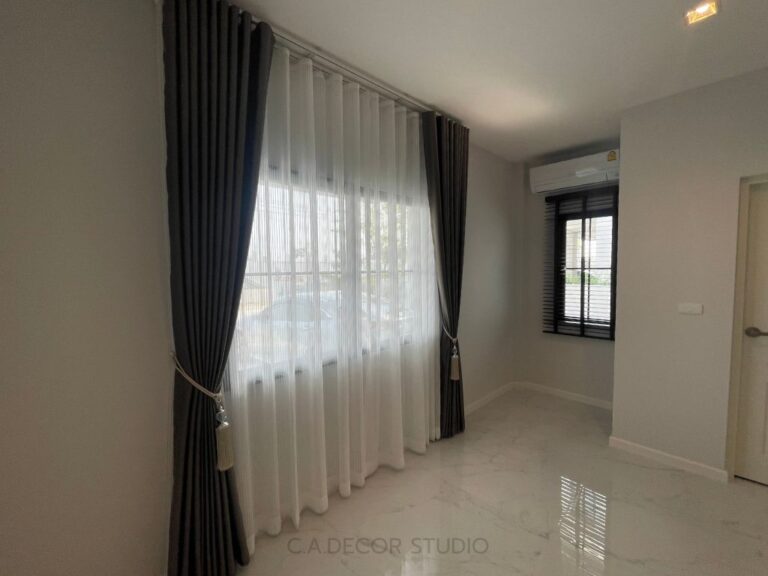 โครงการนี้เลือกทำม่านลอน โดยใช้ผ้าสีน้ำตาลเข้มเนื้อกึ่งเงา ถือเป็นตัวเลือกที่ดีที่จะเพิ่มความหรูหราและมีมิติให้กับบ้านของคุณ ผ้ากึ่งเงาจะช่วยให้ม่านสามารถเล่นแสงได้อย่างน่าสนใจ ไม่ทำให้บ้านมืดจนเกินไป ในขณะเดียวกัน การติดม่านโปร่งที่มีลายเส้นตรงเป็นการเพิ่มลูกเล่นให้กับการตกแต่งภายใน ทำให้บ้านดูมีชีวิตชีวาและมีสไตล์ การผสมผสานระหว่างม่านลอนและม่านโปร่งจึงช่วยสร้างบรรยากาศที่อบอุ่นและน่าดึงดูดใจให้กับพื้นที่ของคุณได้อย่างลงตัว