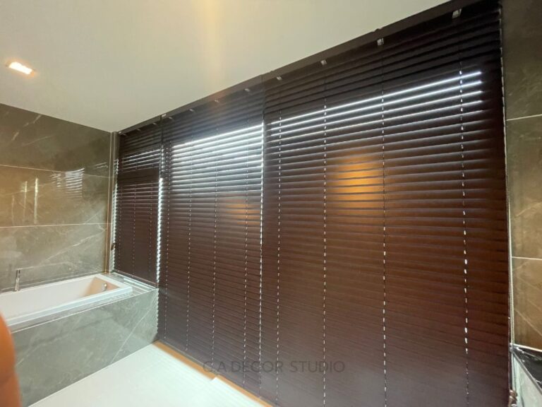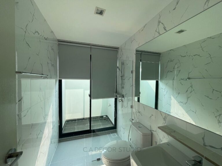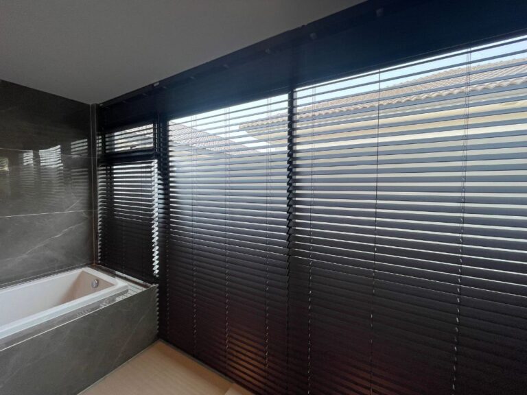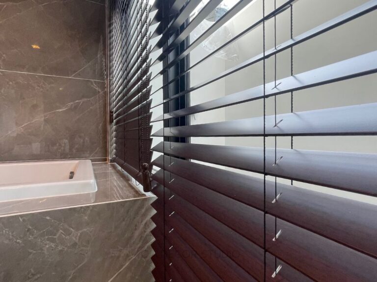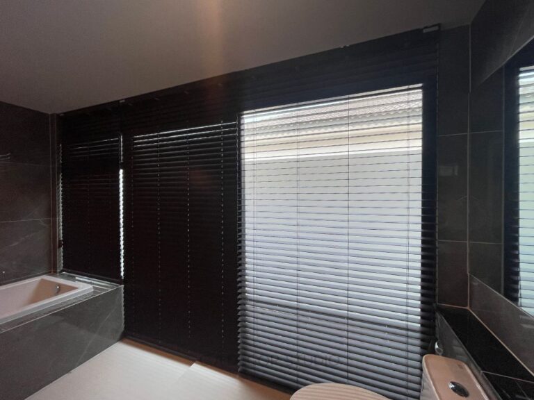 โครงการนี้ ห้องน้ำภายในห้องนอนใหญ่ มีระเบียงขนาดใหญ่ที่เปิดรับแสงธรรมชาติได้อย่างเต็มที่ อย่างไรก็ตาม ความเป็นส่วนตัวก็เป็นสิ่งสำคัญที่ไม่ควรมองข้าม ลูกค้าจึงเลือกใช้มู่ลี่โฟมวู๊ดสำหรับตกแต่งภายในห้องน้ำ มู่ลี่โฟมวู๊ดไม่เพียงแต่เพิ่มความสวยงามให้กับบรรยากาศภายใน แต่ยังมีคุณสมบัติพิเศษที่สามารถกันความชื้นได้ดีเยี่ยม ทำให้เหมาะกับการใช้งานในห้องน้ำ การเลือกใช้วัสดุตกแต่งนี้ไม่เพียงตอบโจทย์ด้านความสวยงามและการประหยัดพื้นที่ แต่ยังช่วยสร้างบรรยากาศที่สงบและเป็นส่วนตัวได้อย่างดี
