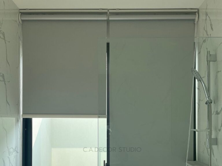 ภายในห้องน้ำห้องนอน 2 มีพื้นที่ค่อนข้างจำกัด บานประตูอยู่ใกล้กับที่วางสบู่จนเหลือช่องว่างเพียงประมาณ 2 เซนติเมตร การเลือกติดตั้งม่านจึงต้องพิจารณาอย่างรอบคอบ โดยม่านม้วนแบบไฟเบอร์กลาสเป็นตัวเลือกที่เหมาะสมที่สุดในสถานการณ์นี้ เนื่องจากเป็นม่านที่ไม่กินพื้นที่มากและสามารถติดตั้งได้ในพื้นที่แคบ ม่านไฟเบอร์กลาสยังมีคุณสมบัติที่สำคัญคือทนต่อความชื้นและน้ำ ทำให้เหมาะกับการใช้งานในห้องน้ำ นอกจากนี้ การดูแลรักษาก็ง่ายดาย เพียงแค่เช็ดทำความสะอาดก็เพียงพอแล้ว