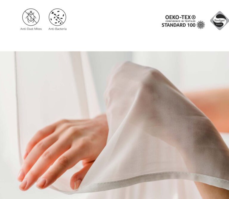 บ้านหลังนี้เป็นตัวอย่างของการใส่ใจสุขภาพของคนในครอบครัวอย่างแท้จริง โดยเจ้าของบ้านเลือกใช้ผ้าที่มีคุณสมบัติลดการสะสมของฝุ่น รวมทั้งกันไรฝุ่นและแบคทีเรีย ซึ่งเป็นการป้องกันที่สำคัญสำหรับการอยู่อาศัยในระยะยาว นวัตกรรมการย้อมผ้าด้วยสารเคลือบลิขสิทธิ์ของ Sanitized ไม่เพียงแค่ช่วยลดการเกาะของไรฝุ่น แต่ยังยับยั้งการเจริญเติบโตของแบคทีเรียอีกด้วย แม้ผ่านการซักถึง 5 ครั้ง ประสิทธิภาพก็ยังคงอยู่ (ประสิทธิภาพจะลดลงทุกครั้งที่ซัก) นี่คือการลงทุนที่คุ้มค่าในสุขภาพและความสะดวกสบายของคนในบ้าน
