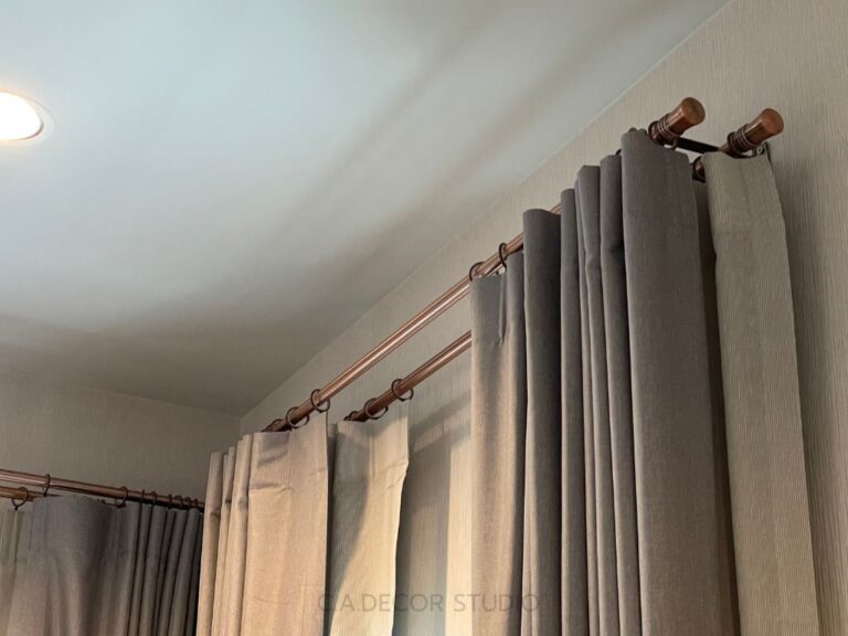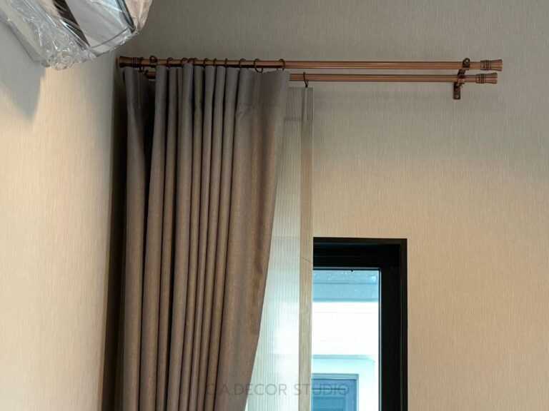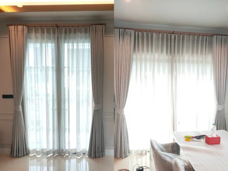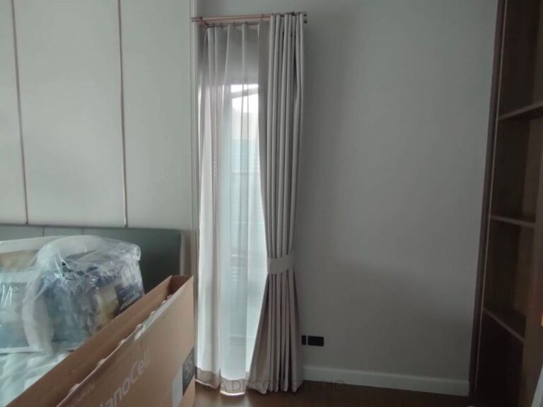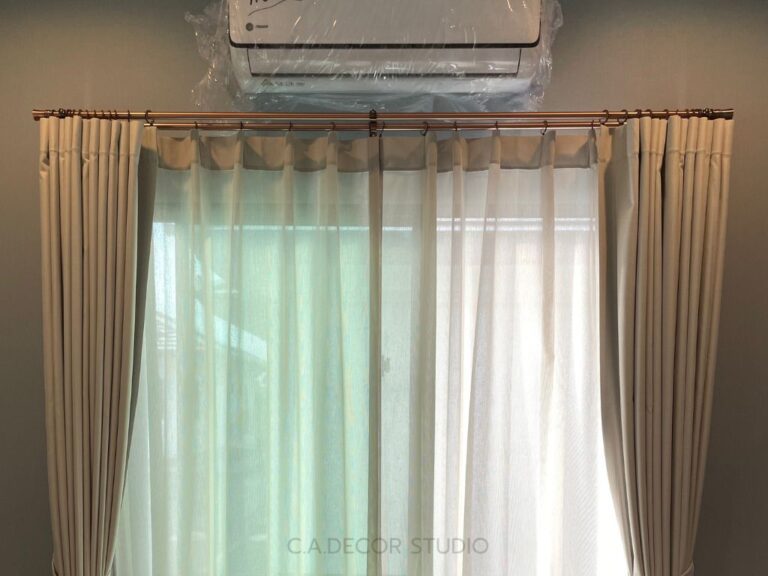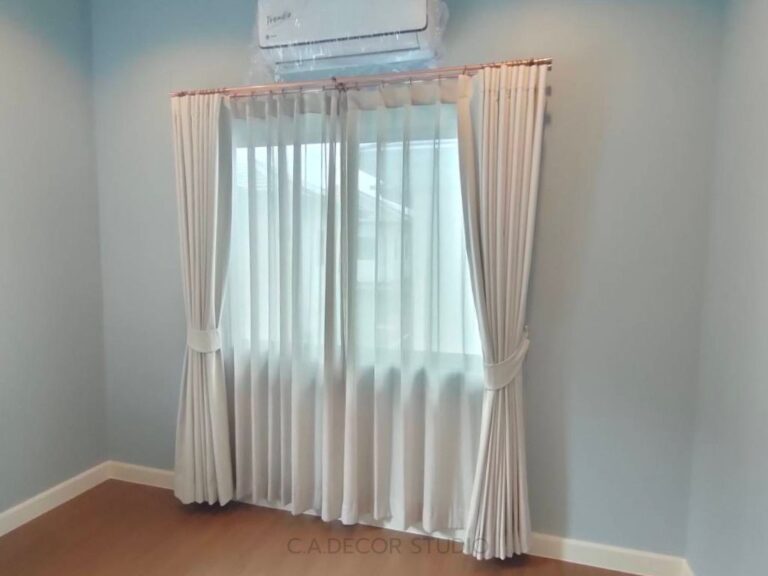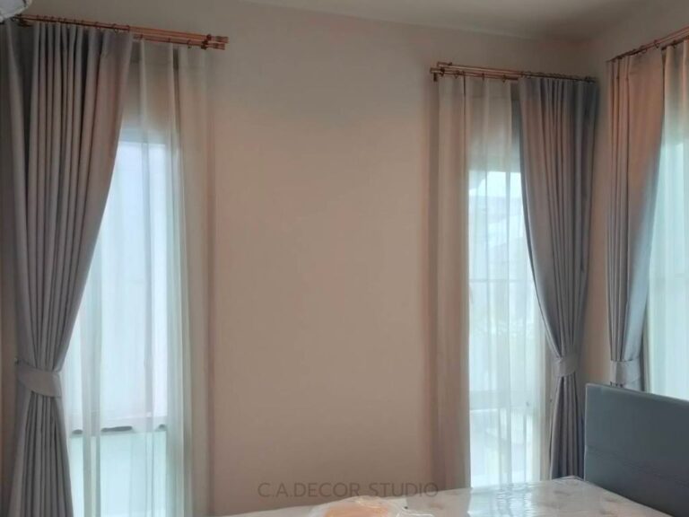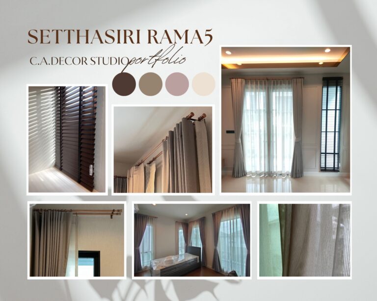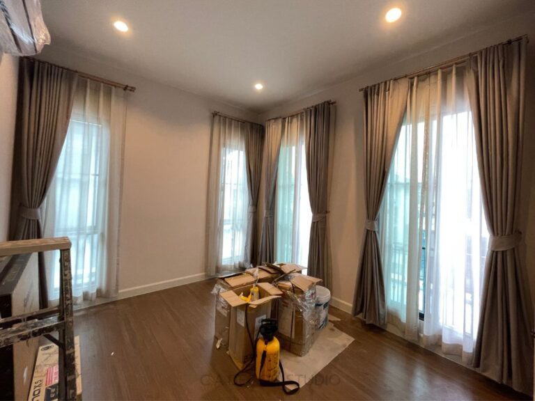 โครงการเศรษฐสิริ พระราม 5 ติดตั้งม่านที่เน้นความเรียบง่ายแต่ยังคงไว้ซึ่งความสง่างามอย่างลงตัว เลือกใช้ม่านลอนรางโชว์ ซึ่งสะท้อนถึงความคลาสสิคและความหรูหรา หัวรางทรงหัวตัดแบบคลาสสิค ขณะเดียวกัน รางสีโรสโกลด์ที่ถูกนำมาใช้ยังเพิ่มเสน่ห์ให้กับบ้าน ทำให้บรรยากาศดู Timeless and Elegant อย่างแท้จริง การเลือกสรรวัสดุและสีสันที่ลงตัวนี้ไม่เพียงแต่ช่วยเพิ่มความสวยงาม แต่ยังเสริมสร้างบรรยากาศที่อบอุ่นและมีระดับในทุกพื้นที่ของบ้าน