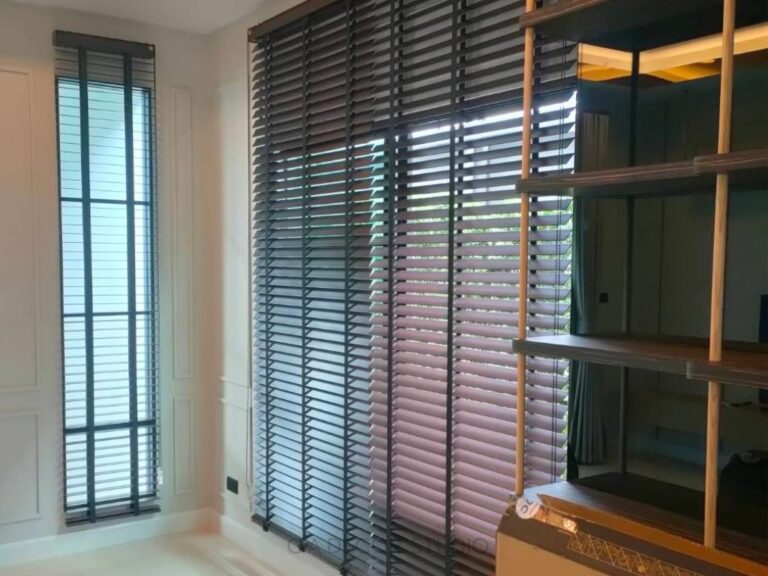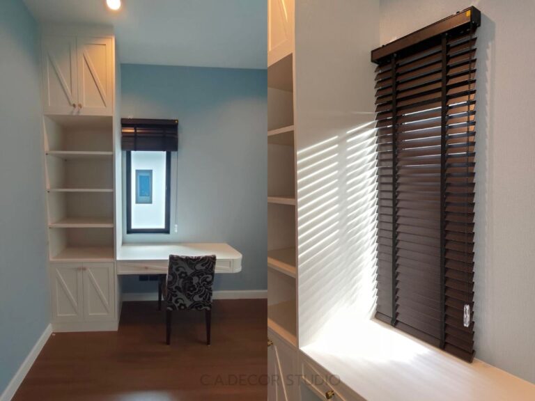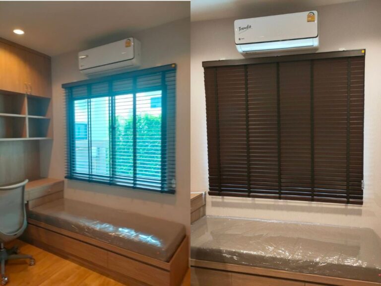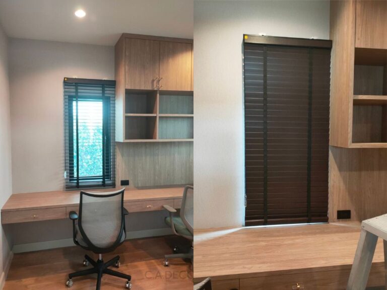 นอกจากม่านลอนรางโชว์ที่เลือกแล้ว มู่ลี่ไม้เป็นอีกหนึ่งไอเท็มหลัก ในการตกแต่งภายใน โดยมู่ลี่ไม้ที่เลือกใช้นั้นมีโทนสีเข้มซึ่งช่วยสร้างความแตกต่างที่สวยงามกับเฟอร์นิเจอร์สีอ่อนภายในบ้าน สร้างบรรยากาศที่สะดุดตาและเพิ่มความลึกให้กับพื้นที่ นอกจากความสวยงามแล้ว มู่ลี่ไม้ยังมีความทนทานและง่ายต่อการทำความสะอาด ทำให้การดูแลรักษาไม่เป็นภาระหนักเกินไป การเลือกใช้มู่ลี่ไม้นี้จึงเป็นการผสมผสานที่ลงตัวระหว่างฟังก์ชันการใช้งานและดีไซน์ที่ทันสมัย
