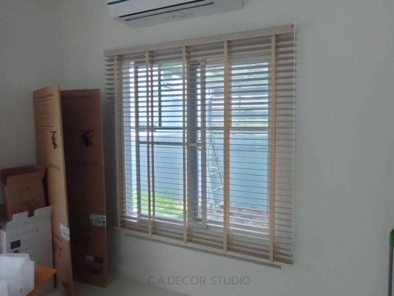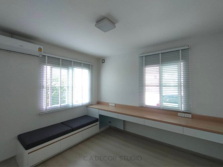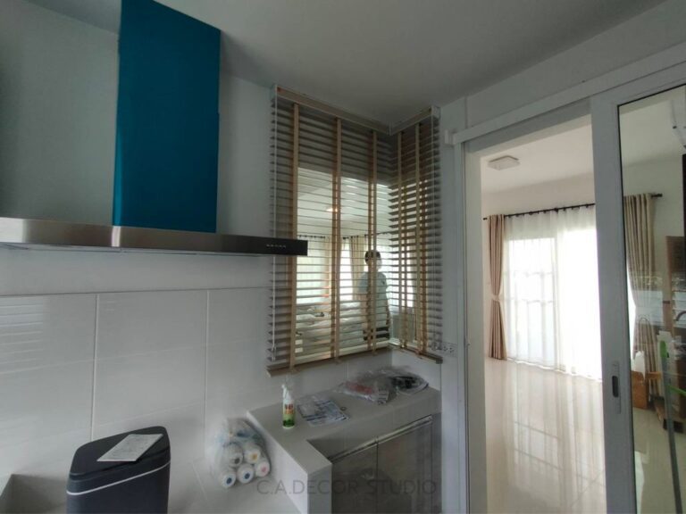 การติดมู่ลี่ไม้ในห้องทำงาน ส่วนทานข้าว และห้องครัว โดยเลือกใช้ไม้ธรรมชาติในโทนสีอ่อน นับว่าเป็นการตกแต่งที่สะท้อนถึงสไตล์มินิมอลได้อย่างลงตัว การใช้ไม้เป็นวัสดุหลักช่วยเพิ่มความอบอุ่นและเป็นธรรมชาติให้กับพื้นที่ อีกทั้งยังช่วยในการควบคุมแสงสว่างได้ดี ทำให้บรรยากาศในบ้านดูโปร่งและสบายตา โทนสีอ่อนของไม้ยังช่วยสร้างความรู้สึกเรียบง่ายและสงบ ซึ่งเป็นหัวใจหลักของการตกแต่งสไตล์มินิมอล