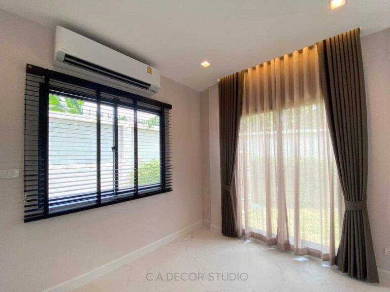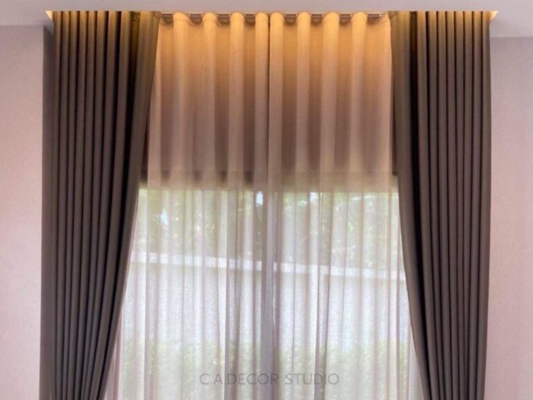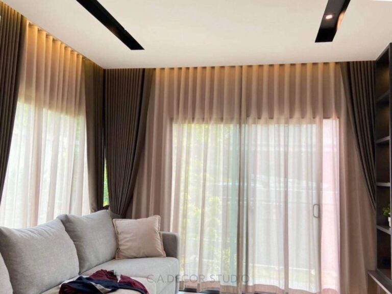 เนื่องจากหลุมฝ้าของลูกค้ามีระยะเพียง 15 เซนติเมตร การติดตั้งม่านในกรณีที่มีข้อจำกัด จำเป็นต้องมีการออกแบบและตัดเย็บที่พิถีพิถันเพื่อให้สามารถรูดใช้งานได้อย่างสะดวก โดยการทำให้ลอนของม่านมีความตื้นลงจะช่วยให้การใช้งานเป็นไปได้อย่างราบรื่น สำหรับการตกแต่งในสไตล์ลักซูรี่ที่เน้นโทนสีเข้ม การเลือกใช้ผ้าม่านสีน้ำตาลเทาเป็นทางเลือกที่ดี เนื่องจากสีนี้สามารถสร้างบรรยากาศที่หรูหราโดยไม่ทำให้ห้องดูมืดเกินไป อีกทั้งยังทำให้สัมผัสได้ถึงความอบอุ่นและทันสมัย ซึ่งส่งผลให้บ้านของลูกค้ามีความสวยงามและมีระดับมากยิ่งขึ้น